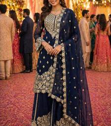 Product Name Navy Blue Real Georgette Wedding Collection Full Stitched Sharara Suits Free Size Upto 44