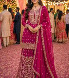 Product Name Pink Real Georgette Wedding Collection Full Stitched Sharara Suits Free Size Upto 42