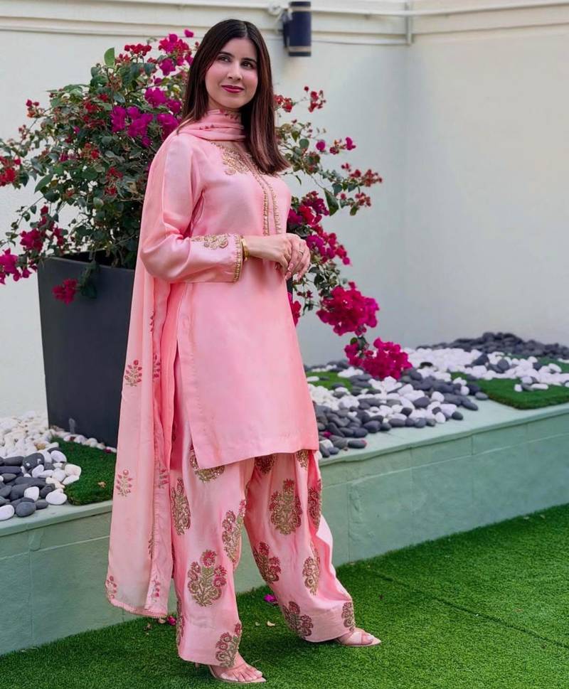 Pink silk blend farshi salwar suit stitched